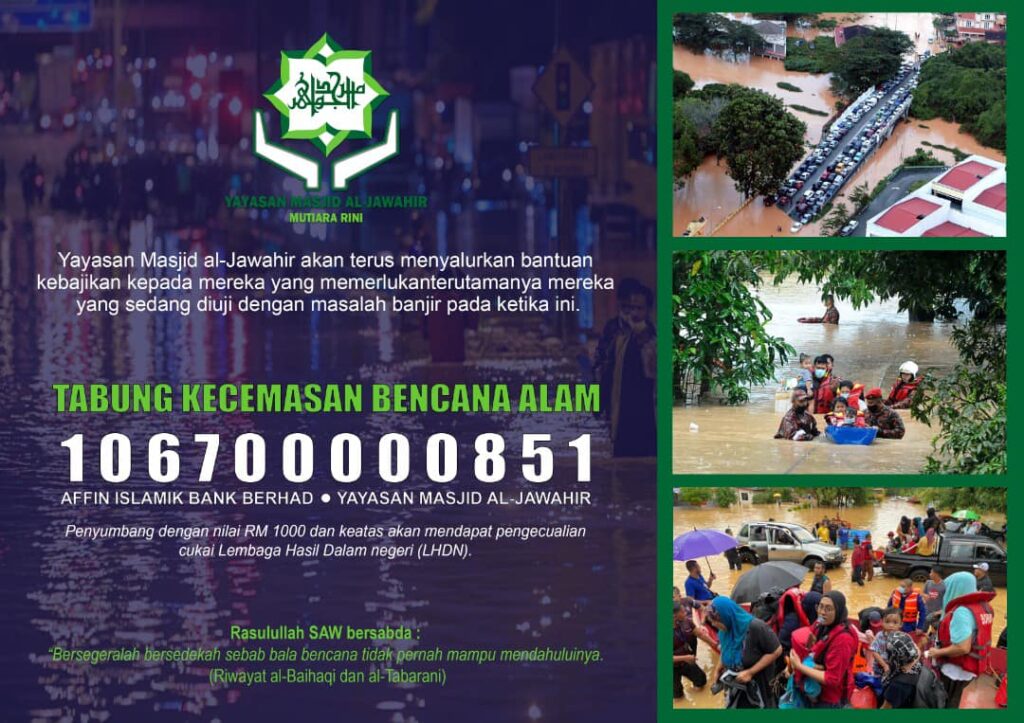 Yayasan Masjid Al Jawahir akan menyalurkan bantuan kebajikan kepada mangsa banjir pada ketika ini. Setiap penyumbang mendapat resit pelepasan cukai LHDN. Salurkan sumbangan anda ke akaun berikut :- *AFFIN ISLAMIK